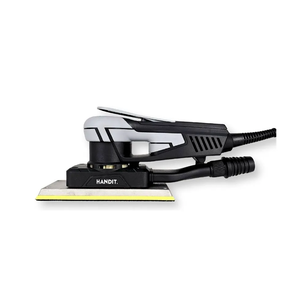 Lijadora eléctrica orbital garlopa Handit Brushlees, diseñada para aplicaciones profesionales de lijado en superficies planas y de gran tamaño. Equipada con motor sin escobillas (brushless) de 350 W, esta herramienta ofrece una excentricidad controlada de 2,5 mm y regulación de velocidad. Disponible en dos versiones de plato: 70 × 197 mm y 80 × 133 mm, ambas compatibles con abrasivos tipo lija garlopa con sistema velcro.